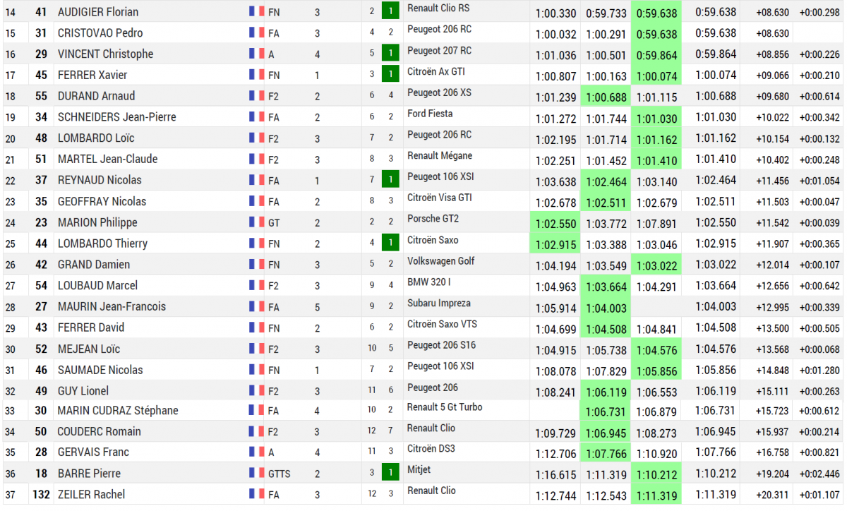 Jérôme Jacquot est une nouvelle fois aux avant-postes puisqu’il place son Speed Car à la deuxième place, en leader de la classe CM. C’est Romain Gelly qui complète le podium avec sa Dallara F303 qu’il impose dans le groupe DE. Quatrième, Arnaud Marcillac remporte le groupe E2-SC avec son Osella. Marie Cammares, neuvième au scratch, termine en tête de la classe DE/4 et remporte la Coupe des Dames.