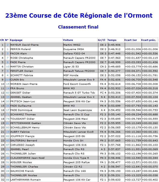 Auteur d’une nouvelle amélioration lors de l’ultime confrontation, David-Pierre Mayeur s’assurait la victoire sur la 23ème édition de l’épreuve vosgienne. Roland Perrin place sa Duqueine IMSA au deuxième rang, devant la Dallara F302 d’Alain Facon. Quatrième, Christophe Rose remporte la classe DE/7 au volant de sa Caparo. Sixième, Christian Martin impose sa Ligier JS 53 en CN.